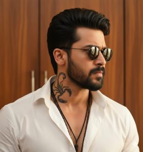 A rugged, stylish man with Face with the face from the uploaded image, keeping the facial features exactly the same. and voluminous wavy hair styled back, wearing round dark sunglasses and a white open-collar shirt. He has a prominent black scorpion tattoo on the left side of his neck and wears layered black chains around his neck. The lighting is soft and warm, highlighting his side profile with a serious expression. The background is an indoor setting with blurred wooden wardrobe doors, creating a casual, intimate atmosphere.