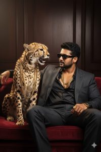 100 PERCENT FACE RESERVED, RADIATING BOSSY GANGSTER VIBES. HE IS SEATED ON A LUXURIOUS VELVET SOFA IN A RELAXED YET COMMANDING POSTURE, LEANING SLIGHTLY TOWARD A CHEETAАН BESIDE HIM. HIS HEAD IS TURNED, GAZING DIRECTLY AT THE CHEETAH WITH A COOL, COMPOSED EXPRESSION, AS IF ACKNOWLEDGING ITS FIERCE POWER. ONE ARM RESTS ON THE SOFA BACK WHILE THE OTHER HAND HOVERS NEAR THE CHEETAH, WHICH IS ADORNED WITH HEAVY GOLD CHAINS. THE MAN IS DRESSED IN HIGH-FASHION DARK ATTIRE, EITHER A SLEEK PINSTRIPE SUIT OR AN OPEN-COLLARED SILK SHIRT WITH BOLD GOLD JEWELRY. SUNGLASSES ENHANCE HIS STYLISH, COMMANDING AURA. THE CHEETAH, SITTING CLOSE TO HIM WITH AN OPEN-MOUTH, FIERCE EXPRESSION, MIRRORS HIS AURA OF RAW DOMINANCE. THE BACKGROUND IS SIMPLE YET LUXURIOUS – A DIMLY LIT LOUNGE WITH VELVET TEXTURES OR DARK WOOD – EMPHASIZING OPULENCE AND DANGER.